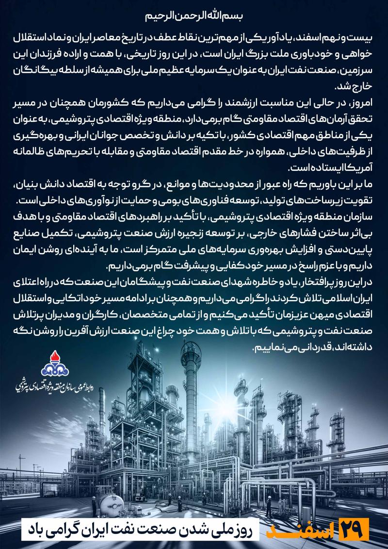 در این روز پرافتخار، یاد و خاطره شهدای صنعت نفت و پیشگامان این صنعت که در راه اعتلای ایران اسلامی تلاش کردند را گرامی میداریم و همچنان بر ادامه مسیر خوداتکایی و استقلال اقتصادی میهن عزیزمان تأکید میکنیم و از تمامی متخصصان، کارگران و مدیران پرتلاش صنعت نفت و پتروشیمی که با تلاش و همت خود چراغ این صنعت ارزش آفرین را روشن نگه داشتهاند، قدردانی مینماییم.
